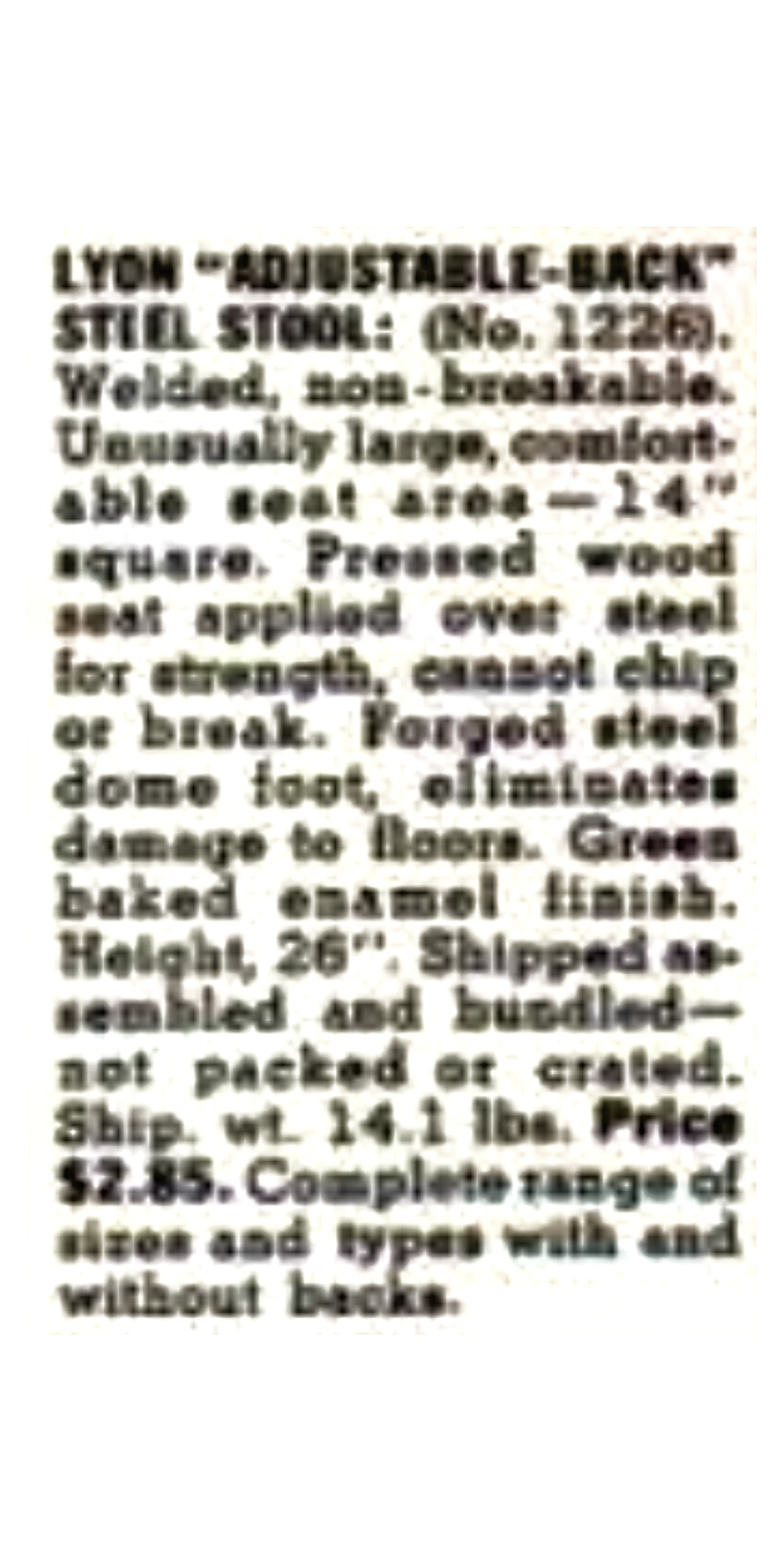 As comparações acima foram baseadas no LYON SHOP EQUIPMENT DE 1944 que demonstra a fidelidade ao modelo de 22″ (polegadas – reduzidas para 55cm descontada a espessura do eucatex) de altura com assento de eucatex (acessório em fibra de madeira); o encosto (ou espaldar) também era vendido separadamente: o equipamento industrial básico tinha seu corpo completo em metal; careca: sem prolongadores, pés ou cobertura no tampo.