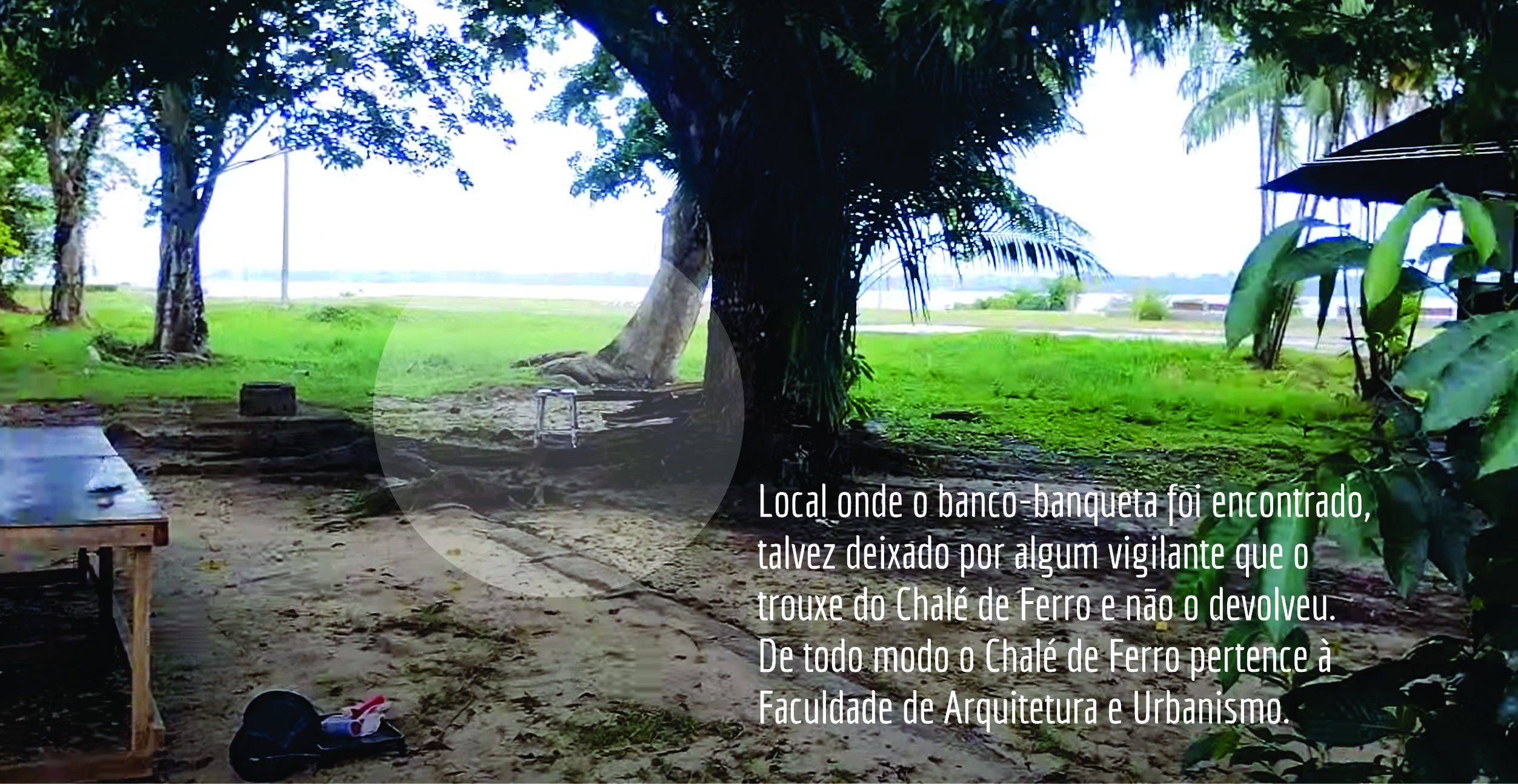 Vanessa e Zé Júlio lembram que o banco/banqueta estava no Chalé de Ferro, inicialmente nele trancado, mas passou a servir de barreira evitando que pessoas adentrassem as varandas do Chalé que também carece de consertos depois que o Numa (Núcleo de Meio Ambiente) o devolveu ao curso de Arquitetura e Urbanismo.