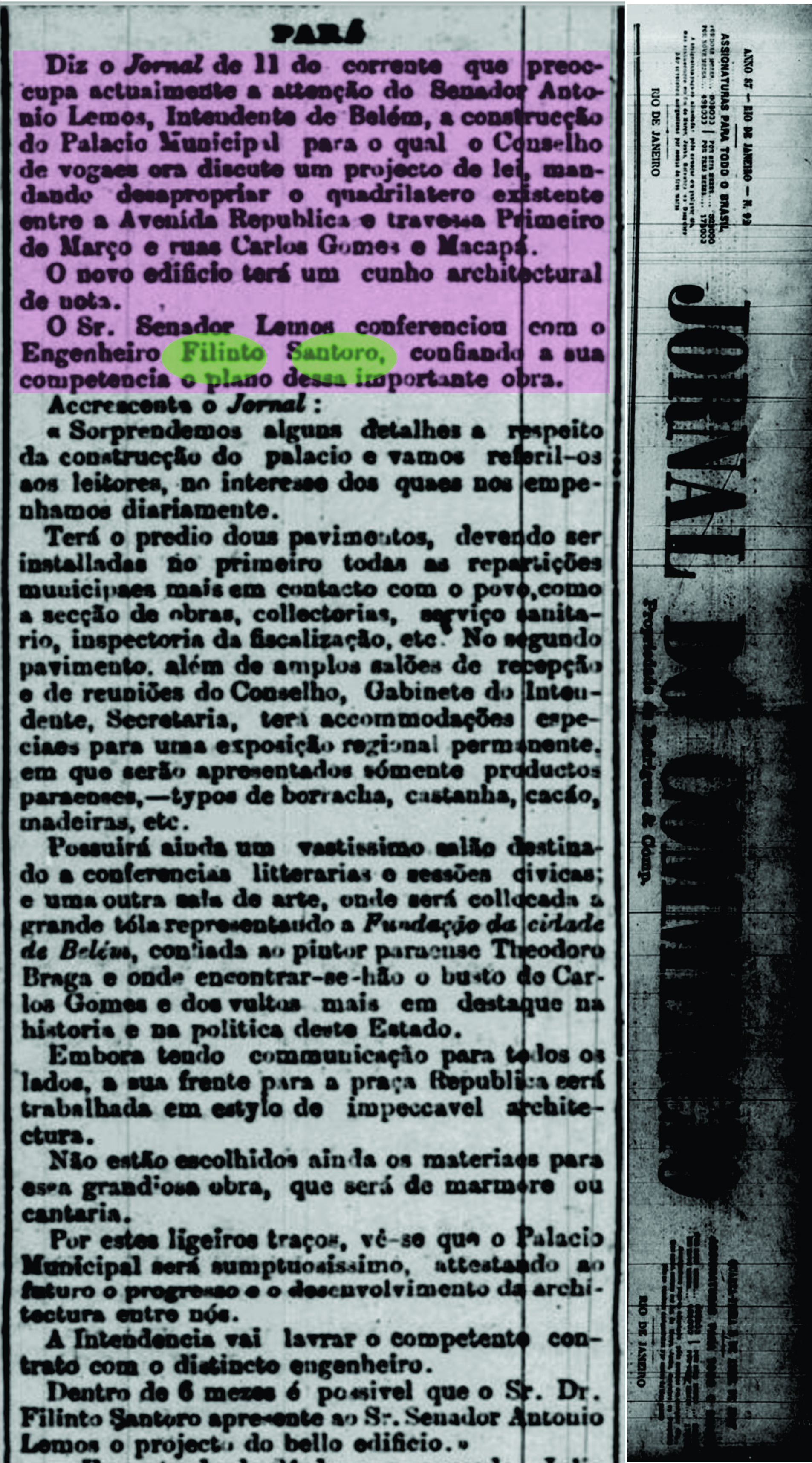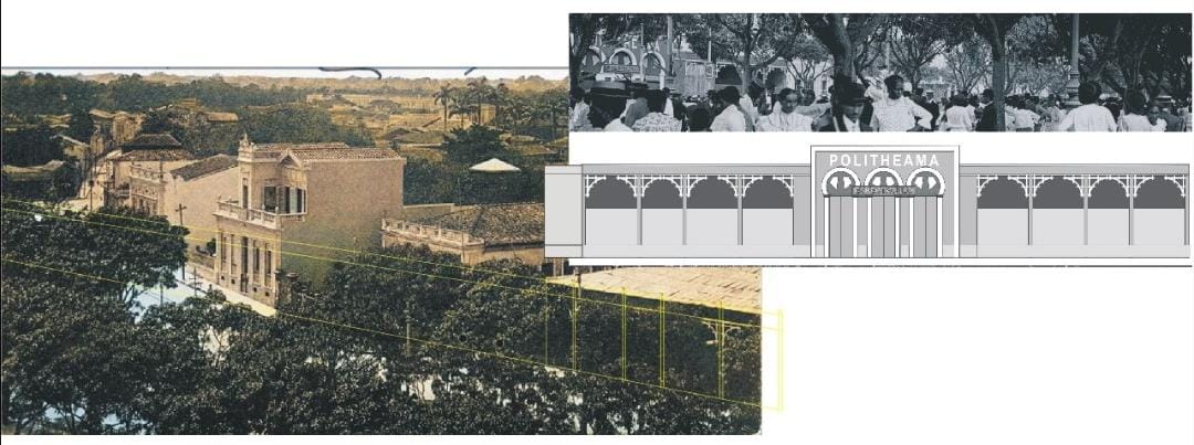 Superposição do Palácio Municipal de Santoro ao Grande Hotel de Mesquita pra se ter a noção da grandiosidade do Rundbogenstil (Estilo Arco Redondo) proposto a Antonio Lemos pelo engenheiro italiano – neste local existiu outra casa de espetáculos, o Politheama, do qual ainda não possuímos imagem completa, mas um desenho a partir de fragmentos fotográficos.