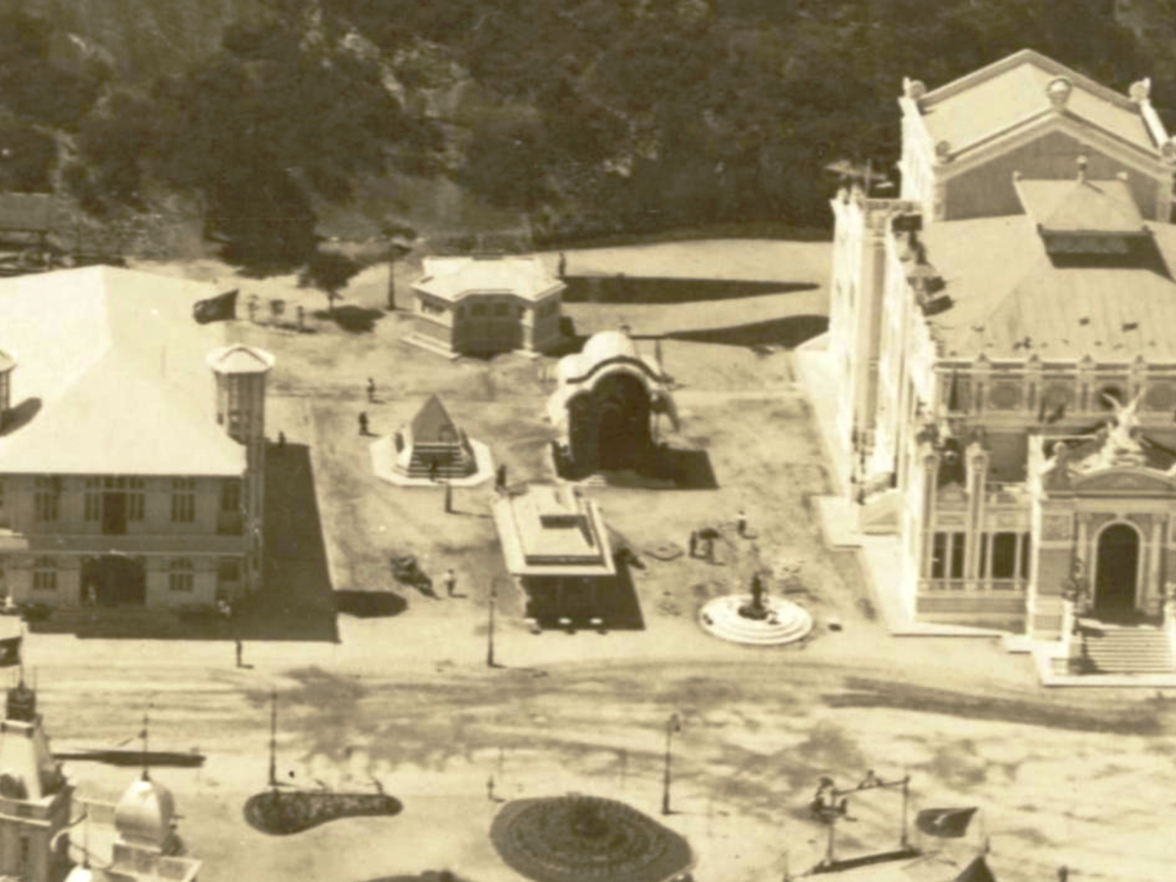 A foto de Augusto Malta registra, à esquerda, o kiosque da Fabrica de Cerveja Paraense de parecença a um búfalo encangado na carroça; tal stand estava ladeado por dois grandes edifícios: o Theatro e o Pavilhão dos Bombeiros