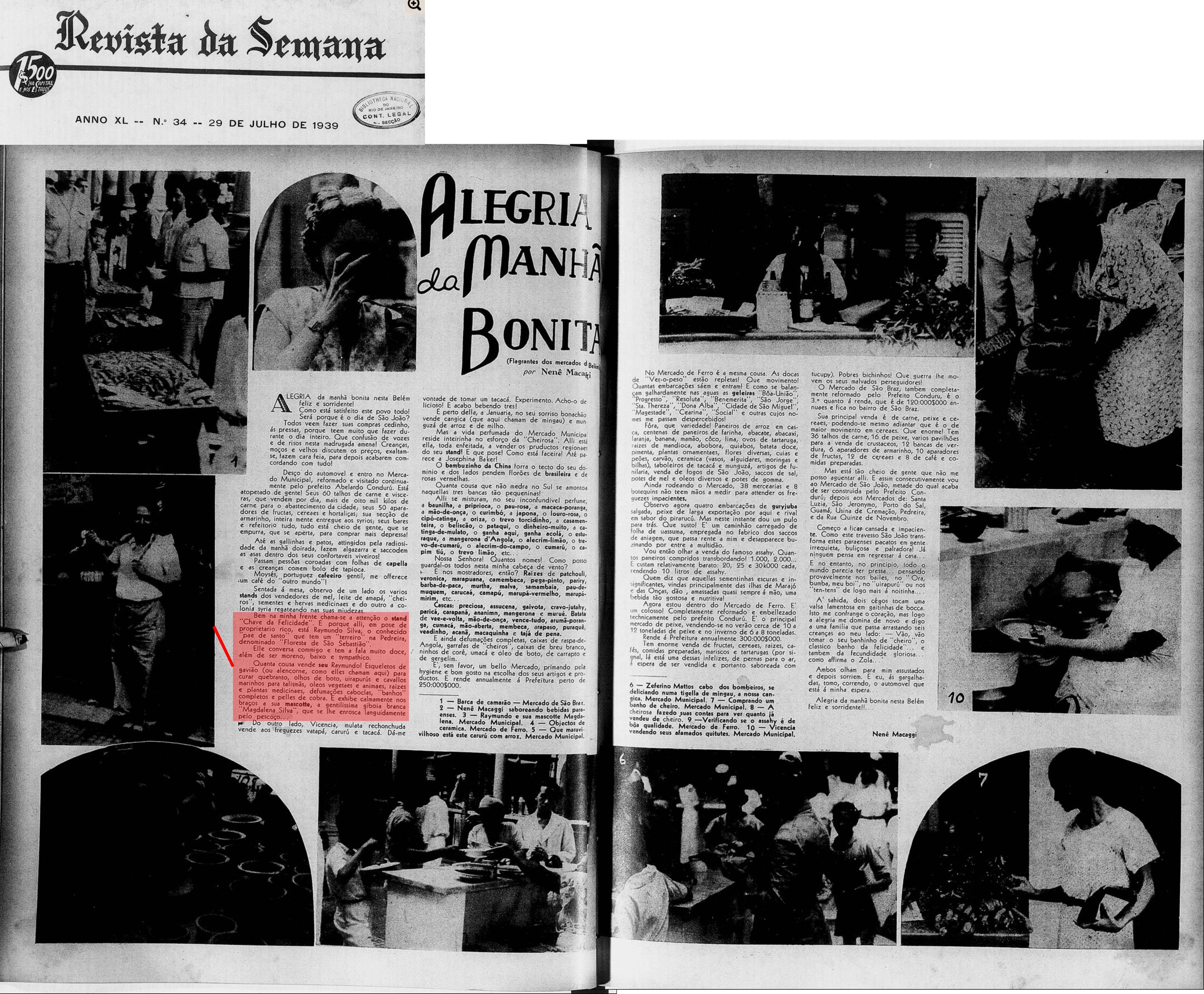 Do mesmo modo que o terreiro (de Umbanda) da Pedreira já tinha destaque nacional desde o final dos anos 1930 propalado pela Revista da Semana com fotografia do stand Chave da Felicidade, no Ver-o-peso, em que Raimundinho aparece em foto com sua gentilíssima giboia branca Magdalena Silva.