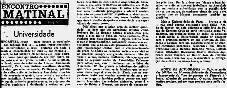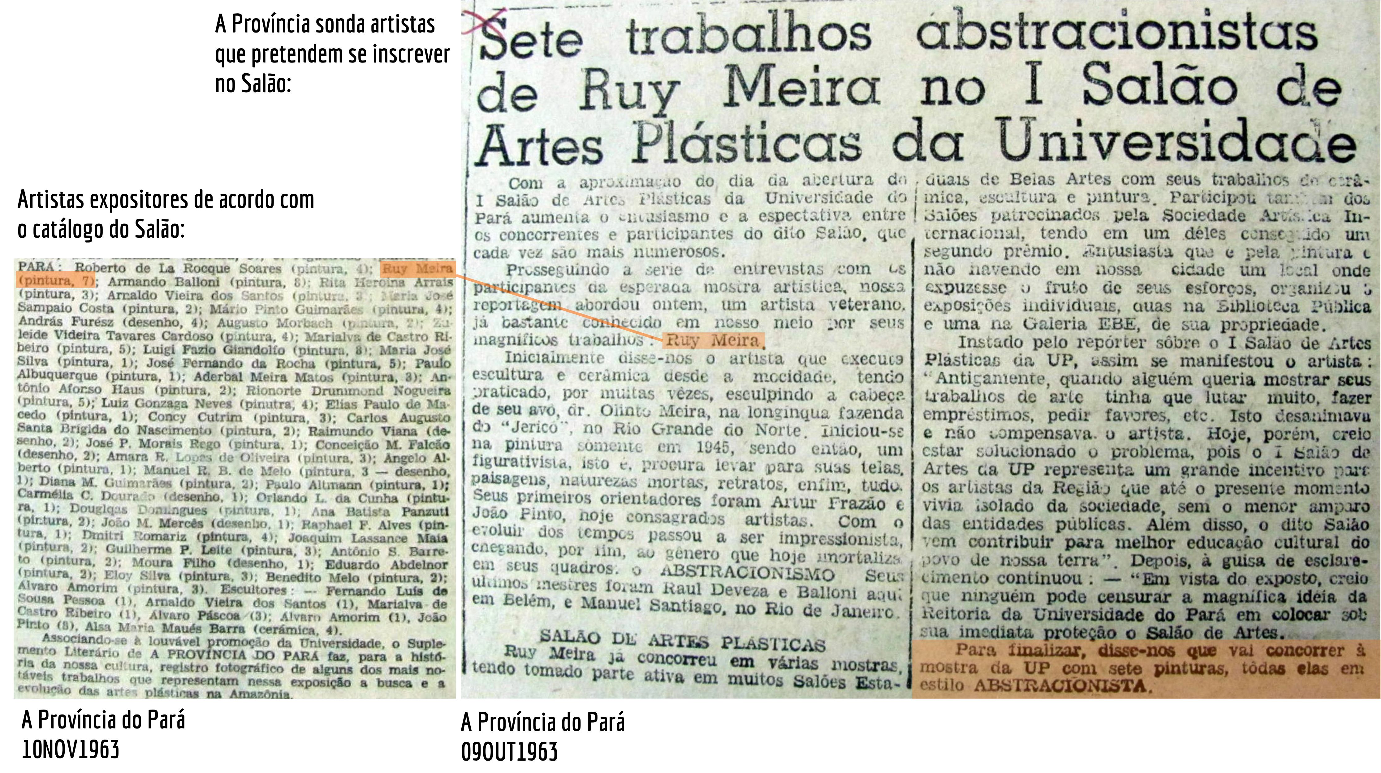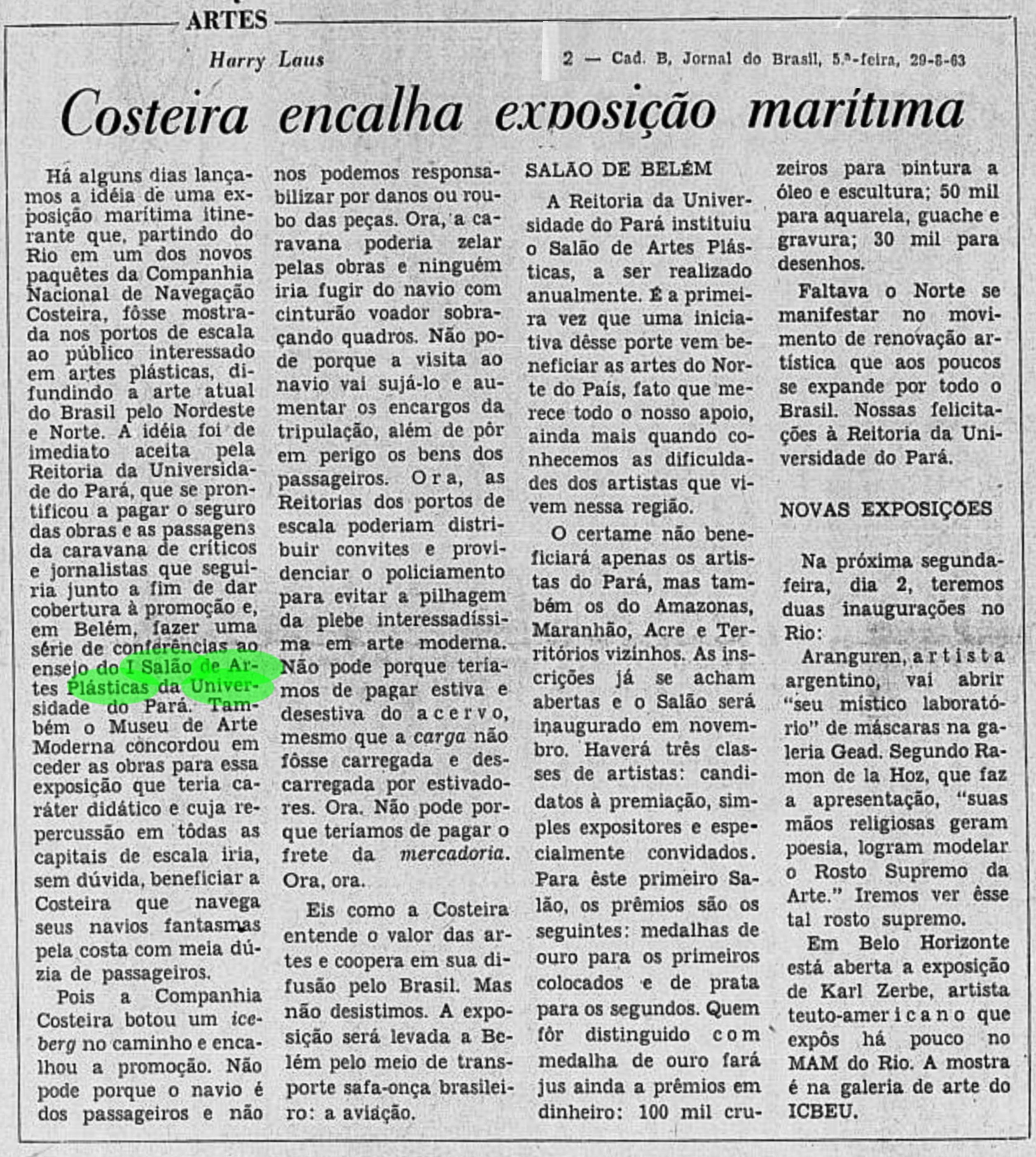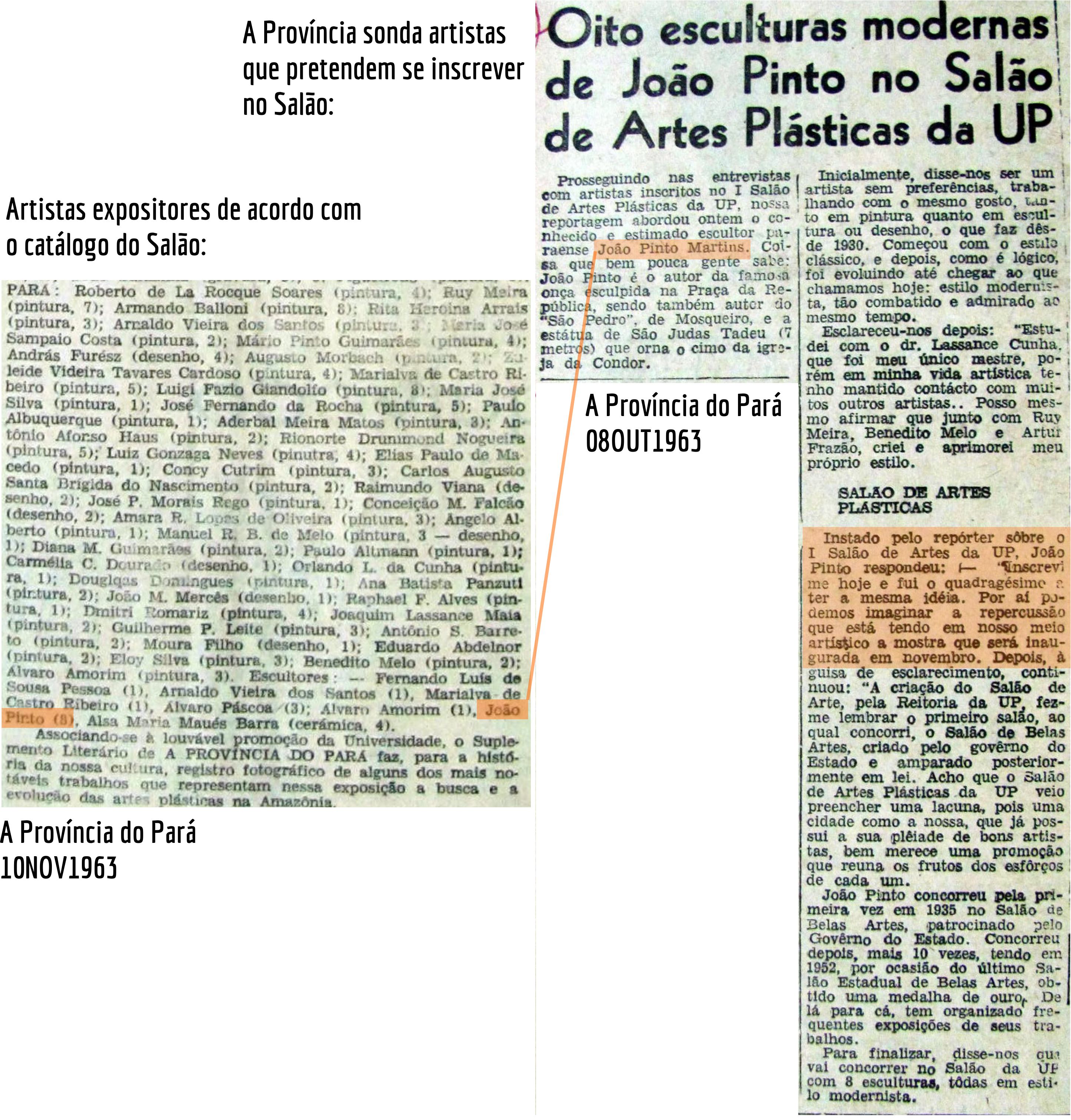 A revista Manchete, em sua edição de 04JAN1964, dá destaque ao Iº Salão de Artes Plásticas da UP como O Salão da Amazônia, mostra montada na sede social do clube Assembléia Paraense, na avenida Presidente Vargas – a matéria do magazine fora tardia, já que a exposição teve seu vernissage no dia 1° de novembro de 1963, às 17 horas, segundo convite público estampado em A Província do Pará do dia.