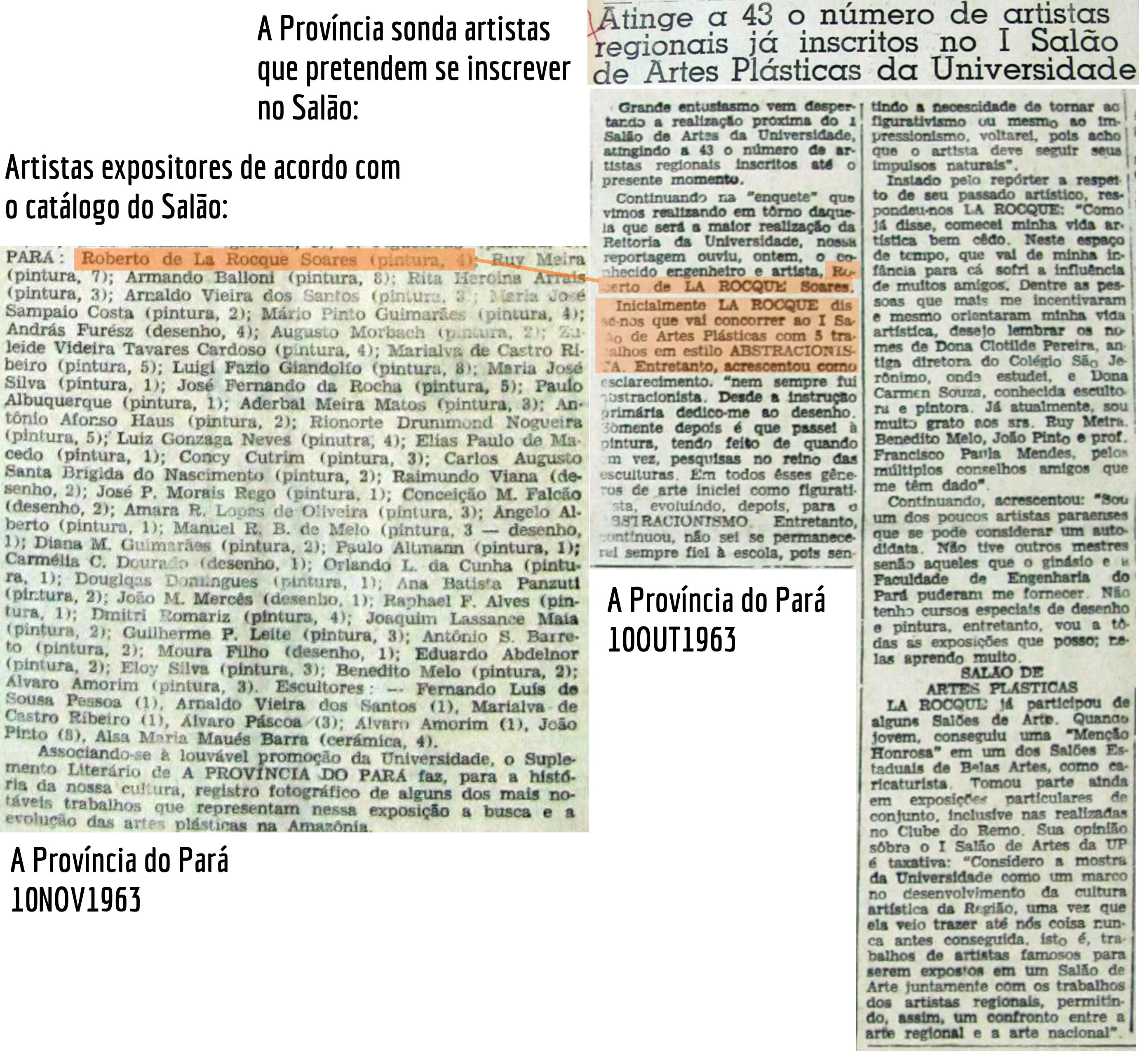 O jornal A Província do Pará do dia 10NOV1963 reproduz, na ordem orientada pelo catálogo, o nome de todos os participantes (regionais) do Salão – demos destaque aos paraenses, alguns dos quais entrevistados pela Província no período de inscrição e que terão suas falas reproduzidas ao final desta matéria, nas referências. Ainda não foi possível, pelo desencontro das informações nas mídias, listar os intelectuais que foram trazidos pela Universidade com o aval do MAM-Rio; também não alcançamos um rol confiável das obras/artistas que vieram junto como bagagem, nem a programação e as atividades culturais que eles (“do MAM”) propuseram e cumpriram – nas reportagens temos fragmentos que ainda não se confirmaram. Por repetição de notas, obras da polonesa radicada no Rio de Janeiro, Fayga Ostrower, e do pernambucano, Darel Valença Lins, estiveram penduradas nos painéis montados na Assembléia Paraense.