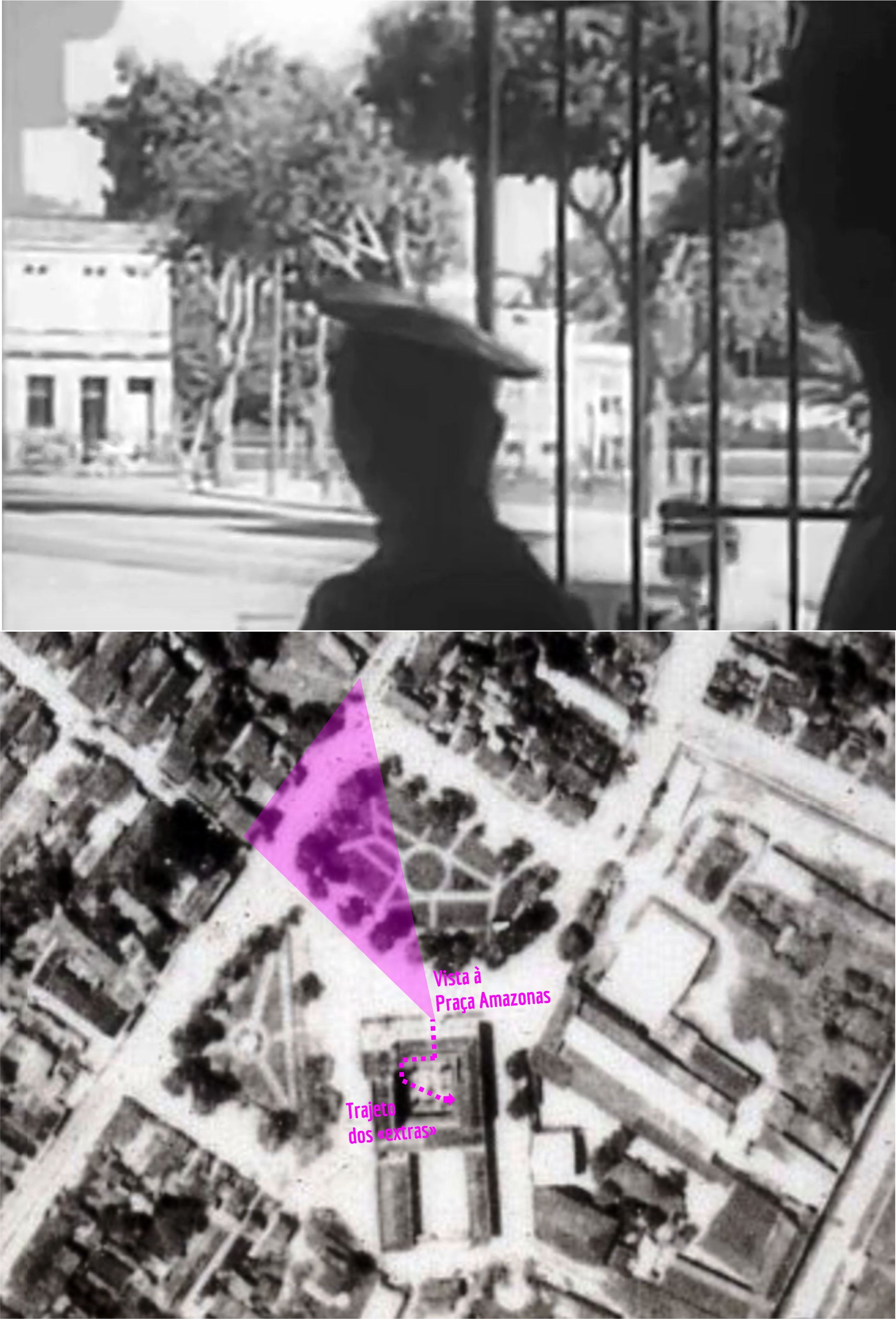 Escapuliu um estúdio nos cortes que fizemos; entretanto, servirá como mais um exemplo de que as externas independiam dos atores (inclusive de Bibi e Sabu), poderiam ser os “extras” (figurantes contratados na rota Belém-Manaus-Belém) nos quais lhes coubessem as vestes – esse molde (ou manequim) é citado nas revistas à continuidade das cenas em sets dos estúdios londrinos. O gif já abre discussões: na externa estaríamos vendo a bunda de Sabu; e o desenho dessa grade? Observemos também o quanto o casal está próximo e distante (num só tempo) da marcação do piso; infiel à realidade, mas plenamente licenciado à ilusão do espectador: uma fábrica de sonhos. Os atores e “extras” podem caber nas mesmas roupas, mas não mostram nem a mesma compleição física, nem cabelos assemelhados; ou seja: sabe-se lá quem foi a dupla imortalizada pelo cinema universal sem qualquer registro no cast. No mundo vivo da Belém de 1946 tem obras nas vias; há a vestimenta do povo, que o agrupa ou dissocia; há o parque de diversões junto ao (desabado) Pavilhão de Vesta apinhado de gente; há o presídio de São José numa tranquilidade mosteiral donde do seu portão de entrada se avista uma charrete contornando a pacata Praça Amazonas; certamente há muito mais, resta-nos perceber sinais e batear.